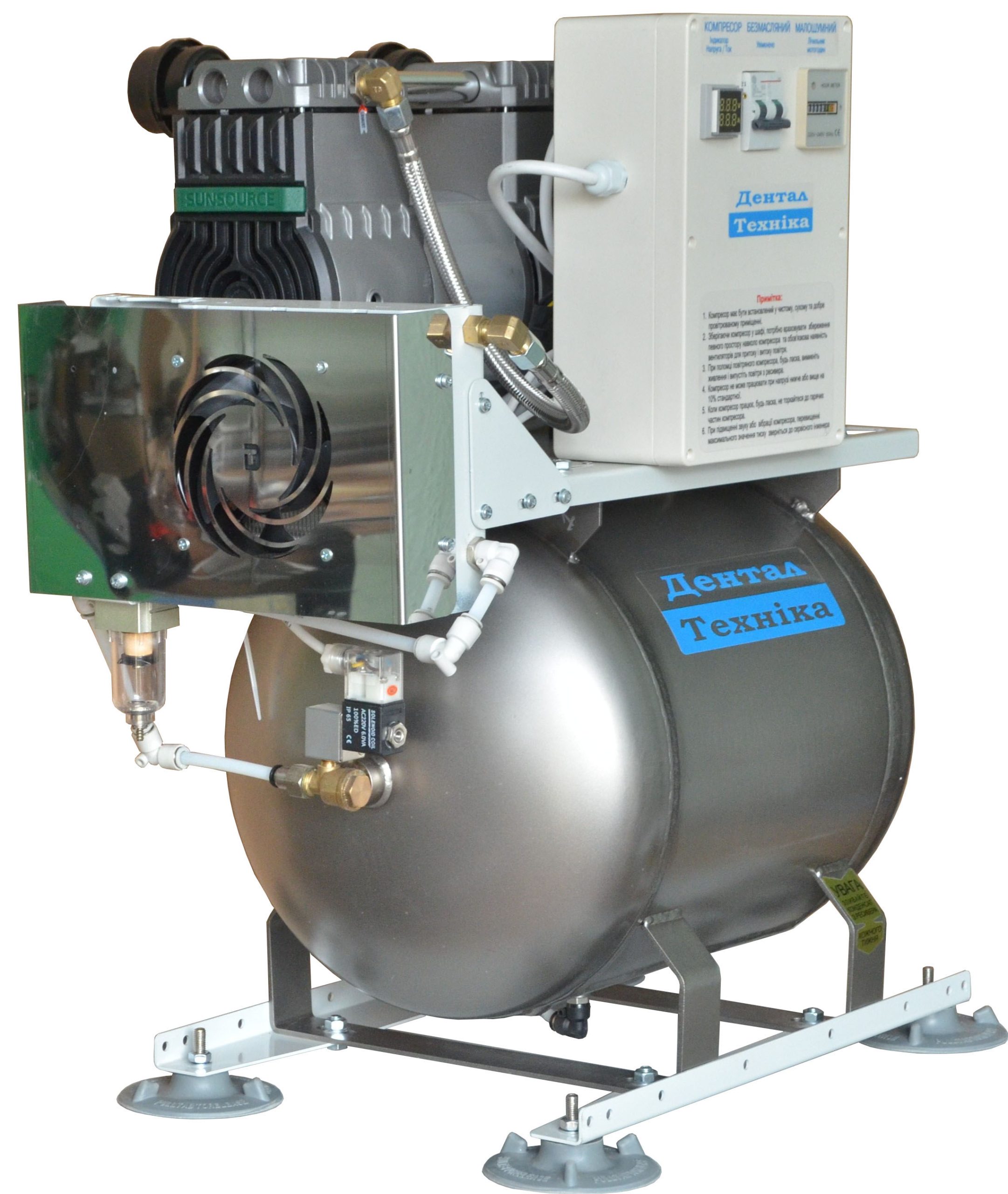 Компресор призначений для забезпечення стисненим повітрям пневматичного обладнання, апаратури та інструменту. Безмасляний компресор, забезпечує подачу чистого повітря, має доступну ціну і не вимагає спеціального технічного обслуговування. Відносно робочих характеристик і габаритних розмірів наші компресори можуть задовольнити будь-які вимоги при оснащенні окремого стоматологічного кабінету, клініки або навчального закладу, який готує фахівців-стоматологів.