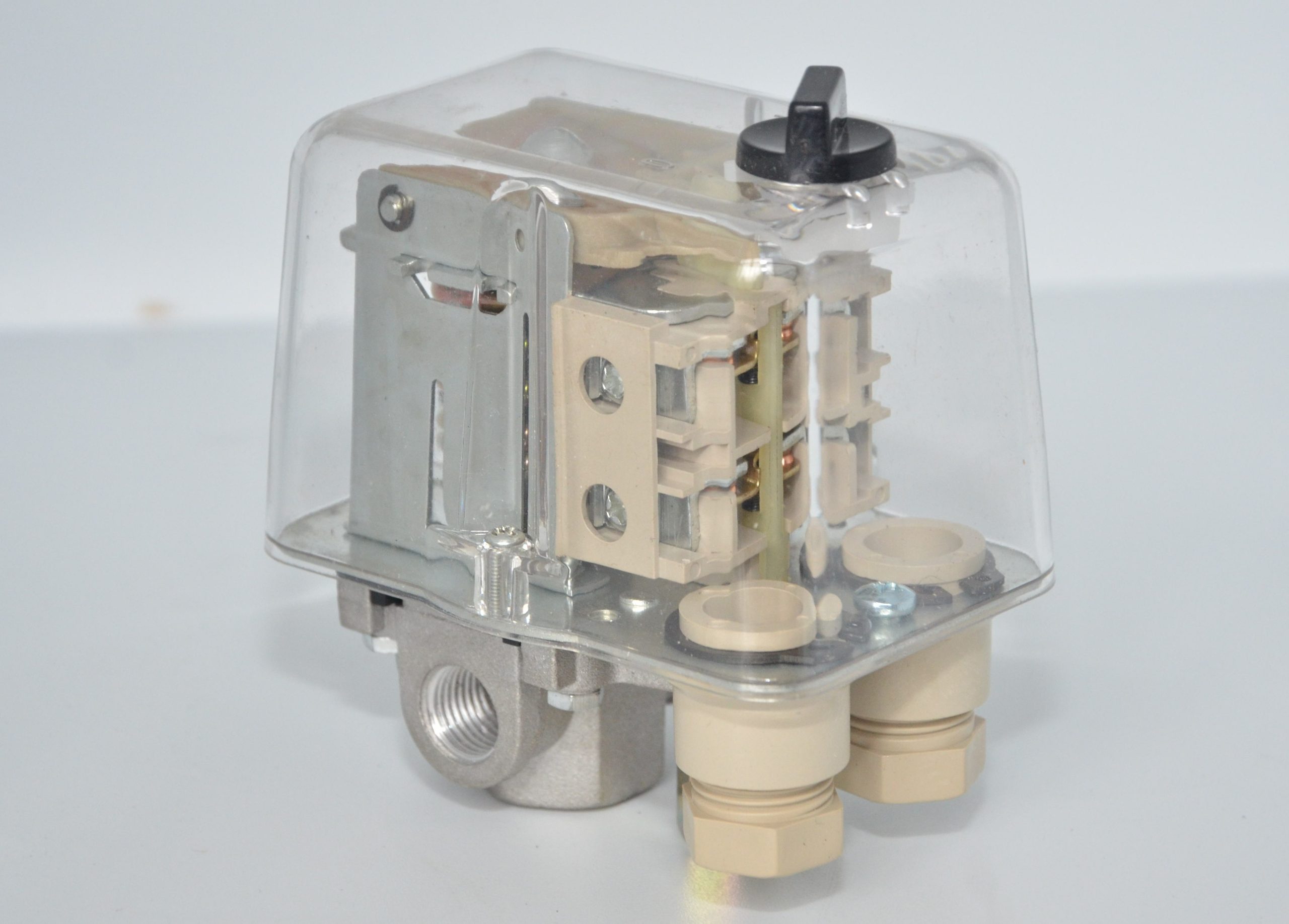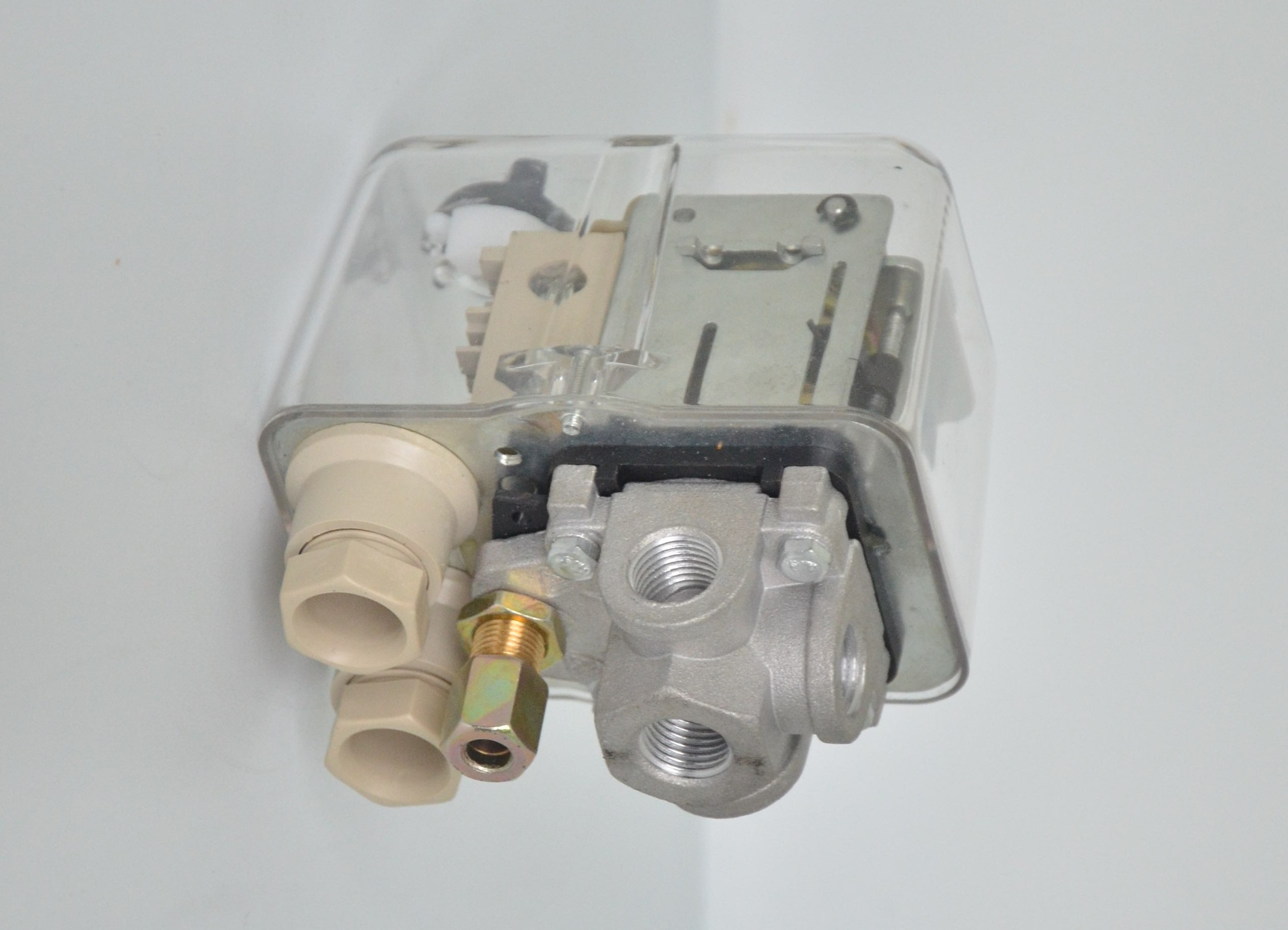 Реле тиску (Пресостат) призначенний для регулювання роботи компресора. При досягнені встановленого максимального тиску реле напруги розмикає електричні контакти, а при досягнені встановленого мінімального тиску реле напруги замикає електричні контакти. Регулюється реле шляхом встановлення специальними гвинтами максимального тиску та дельти між максимальним та мінімальним тиском.